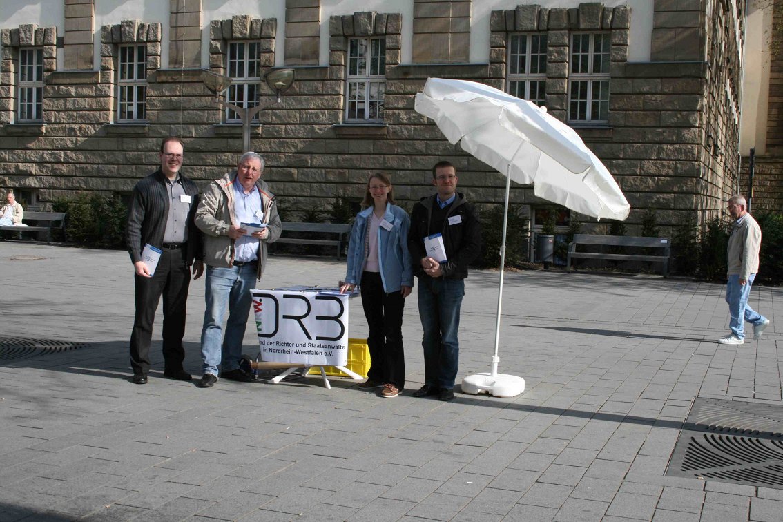 „ Das ist eine stolze Zahl“, meinte Staatsanwalt Jens Hartung, der einer der vielen fleißigen Helfer war. Die Vorsitzenden Richter am Landgericht Michael Foos, Martin Collas und die Vorsitzende Richterin Antje Reim sowie RiLG Thomas Posegga komplettierten die Mannschaft um den Bezirksgruppenvorsitzenden Jochen Hartmann.Den Zusammenhalt der Ruhrgebiets-Bezirksgruppen unterstrichen die Essener Kollegen durch die Unterstützung und Teilnahme der neuen Bezirksgruppenvorsitzenden Dr. Ute Strasser und der Beisitzerin im Landesvorstand, Oberstaatsanwältin Angelika Matthiesen. Für deren engagierte Mitwirkung dankte Hartmann im Besonderen und sagte zugleich Unterstützung der Essener Kollegen in der Zukunft zu. Begleitet wurde das Team durch einen Reporter des WDR, der die Stimmung am Informationsstand und einen „O-Ton“ des Bezirksgruppenvorsitzenden einfing. Anwesend war auch ein Vertreter der NRZ, die bereits im Vorfeld ausführlich über den Infostand und die Demo am 29.4.2010 berichtet hatte.