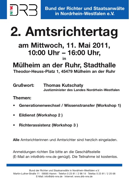Der DRB NRW e.V. hat einen regelmäßigen Amtsrichtertag, von Amtsrichtern für Amtsrichter, ins Leben gerufen, um die Bedeutung der Amtsrichterinnen und Amtsrichter im bestehenden Justizsystem zu unterstreichen.