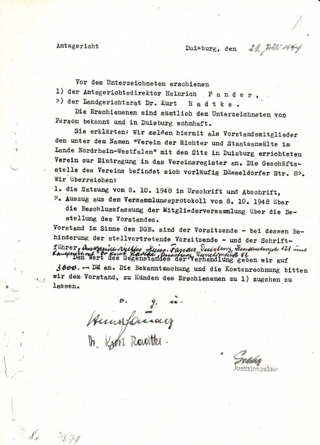 Der „Verein der Richter und Staatsanwälte im Lande Nordrhein-Westfalen“ wurde am 29. Juli 1949 zum Vereinsregister beim Amtsgericht Duisburg angemeldet und der Nachweis der Eintragung erschien am 30. September 1949 im Öffentlichen Anzeiger zum Amtsblatt der Bezirksregierung Düsseldorf. Der seit dem Herbst 1947 aufgebaute und im März 1948 in Duisburg gegründete Verein hat am 8. und 9. Oktober 1948 in Recklinghausen seine erste Mitgliederversammlung abgehalten. Dort wurde die erste Satzung verabschiedet und der bisherige vorläufige Vorsitzende Heinrich Fander (Amtsgerichtsdirektor in Duisburg) zum Vorsitzenden gewählt. Wie Schultz (MDR 1948/391) berichtet, war die in der „Engelsburg“ abgehaltene öffentliche Kundgebung vom 09.10.1948 stark besucht und entsprach ihrem sachlichen und repräsentativen Zweck. Musik von Gluck, Lortzing und Weber umrahmte stimmungsvoll die rednerischen Darbietungen. Den Höhepunkt bildeten der Festvortrag von Prof. Dr. Eberhard Schmidt (Göttingen) über das Thema „Berufsjurist und staatliche Rechtspflege“ und die Verabschiedung von neun Thesen zur richterlichen Unabhängigkeit durch die Versammlung, deren Inhalt so aktuell ist, dass sie nachzulesen nur jedem interessierten Mitglied empfohlen werden kann. Wegen des langen Entstehungsvorlaufs wählt der Vorstand für die 50-Jahre-Feier mit Rücksicht auf die Eintragungen als Verein im Jahre 1949 die LVV 1999, obwohl die Festveranstaltung zum 25-jährigen Jubiläum bereits im Jahre 1973 in Münster stattfand. (Auszug aus RiStA 06/2009)